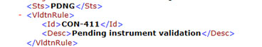 • Transaktionen innehåller inga fel men instrumentdata saknas fortfarande dag T+1-> transaktionen får status 'PDNG' och ingen FD-fil skapas. Validering kommer att upprepas mot den uppdaterade referensdatan varje dag i upp till 7 kalenderdagar från den dag som transaktionsrapporten togs emot. En FD-fil kommer att skapas först när statusen för transaktionen ändras från 'PDNG' till 'ACPT' eller 'RJCT'. Om referensdata fortfarande saknas när det har gått 7 dagar från att transaktionsrapporten togs emot får transaktionen status 'RJCT' (visas som 'RJCT' i FD-filen).