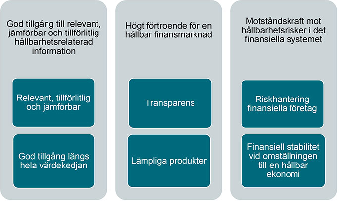 FI:s färdplan innehåller tre mål som vi särskilt kommer att verka för i arbetet med hållbar finansmarknad fram till 2025: