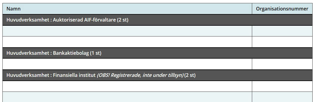 I huvudkategorin delas flera kategorier (instituttyper) in i en grupp. Tex i huvudkategorin Bank visas bankaktiebolag, sparbanker, medlemsbanker och svenska bankers utländska filialer.